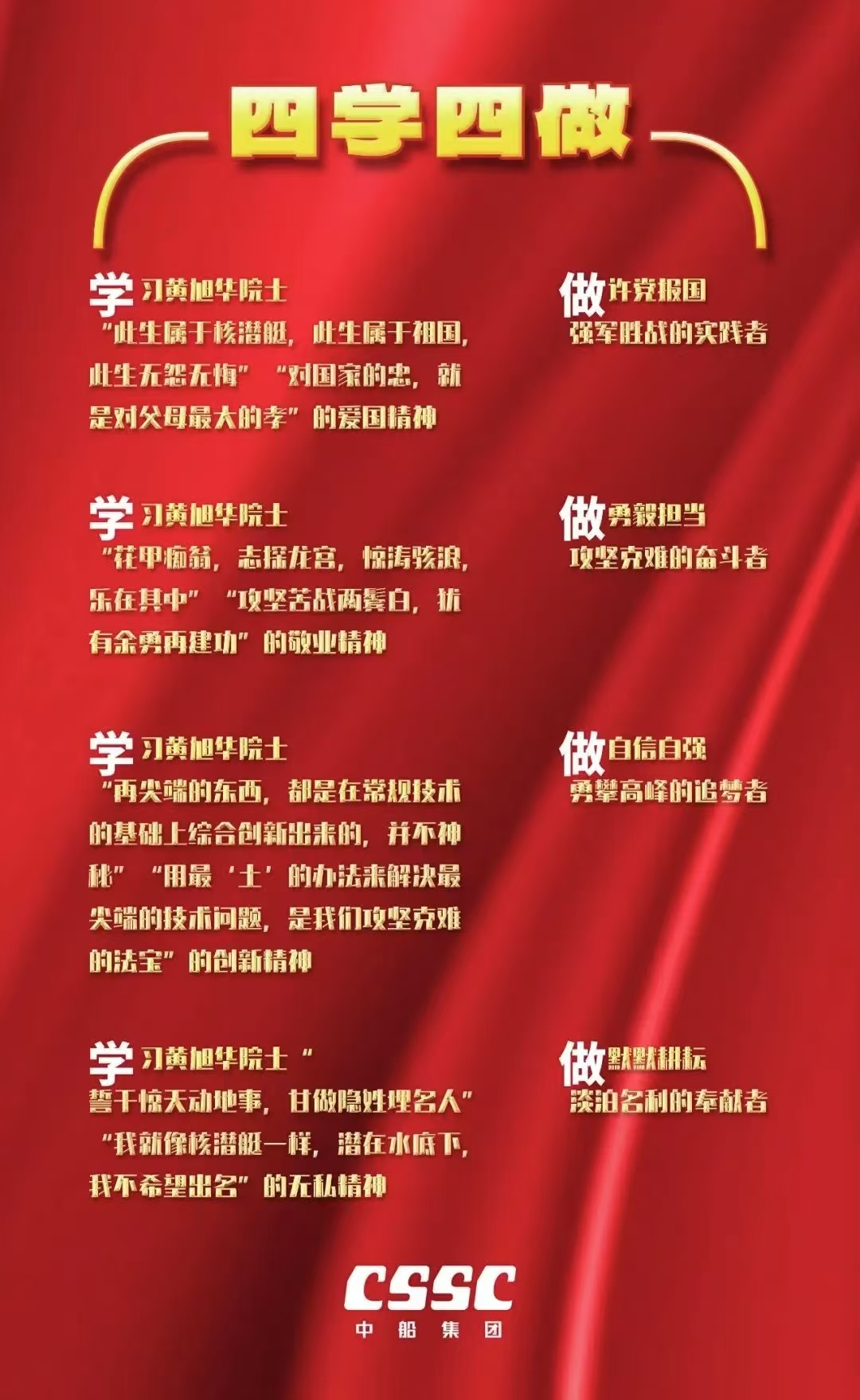 近日,中船集團(tuán)黨組下發(fā)通知,號召全集團(tuán)深入開展黃旭華院士先進(jìn)事跡“四學(xué)四做”活動。公司全體員工要深入學(xué)習(xí)宣傳黃旭華院士先進(jìn)事跡、優(yōu)秀品格和優(yōu)良作風(fēng),繼承黃旭華院士遺志,弘揚核潛艇精神,賡續(xù)中船文化,在新時代新征程中,爭做對黨忠誠、對事業(yè)執(zhí)著的奮進(jìn)中船人,自覺將個人奮斗融入到中船集團(tuán)發(fā)展大局中,切實將學(xué)習(xí)活動成效轉(zhuǎn)化為完成全年任務(wù)目標(biāo)、推動“十四五”圓滿收官的實際成效。